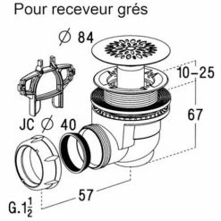- Bonde à grille pour receveur de douche en grès de perçage Ø60 mm, sortie J.C. Ø40, sortie à visser ou à coller, à siphon amovible démontable.