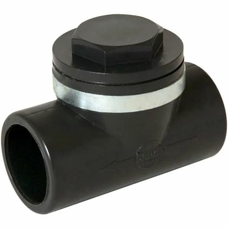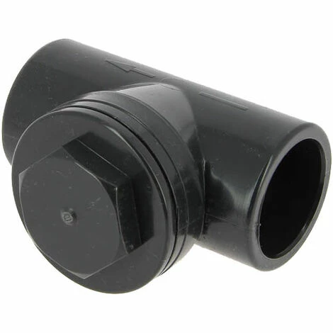 - Té femelle-femelle Ø40 à piquage 90° muni d’un bouchon dévissable avec joint et d’un clapet avec joint.