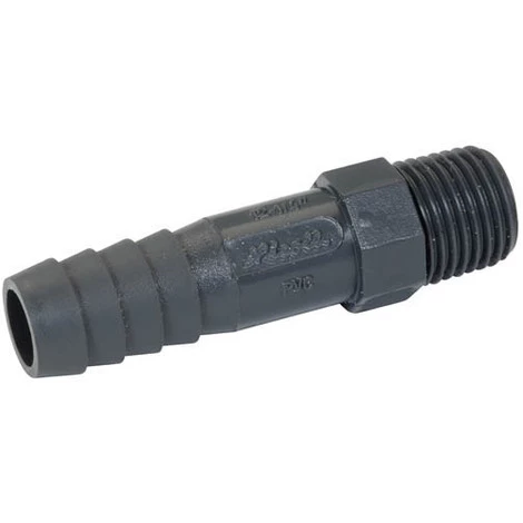 - Embout cannelé en PVC pression avec filetage gaz conique, une extrémité filetée mâle Ø26×34 et une extrémité cannelée mâle Ø71.
