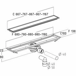 Longueur corps : 880mm – Largeur du corps : 138mm – Largeur de douche mini : 900mm – Largeur grille : 67mm